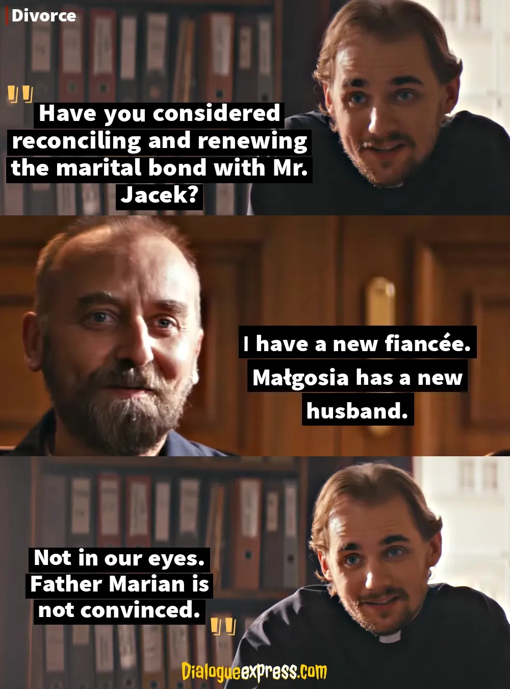 This movie is about a couple, technically ex-spouses who reach the church and try to justify their act of divorce, after 20 years of separation. The couple had parted ways years ago, but chose to get divorced again in the church, unaware of the questions and the situations coming their way. They approach the church and tell the father that the man has a new fiancée now and the lady has a new husband. As shown in the trailer, the father is not satisfied and asks them why they never thought of renewing their relationship.