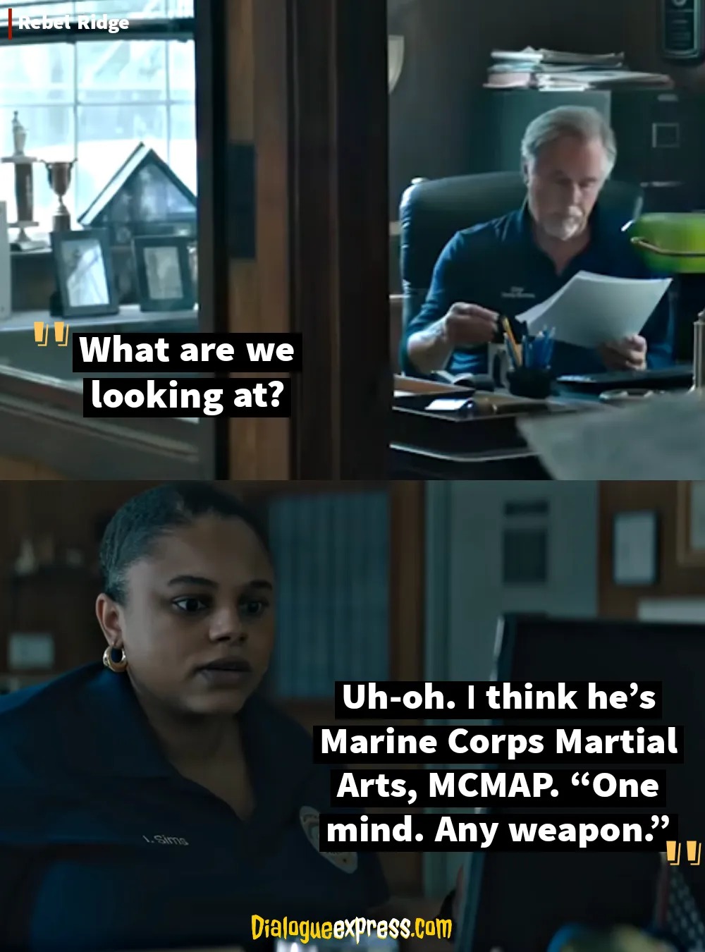 – Uh-oh. I think he’s Marine Corps Martial Arts, MCMAP. “One mind. Any weapon.”