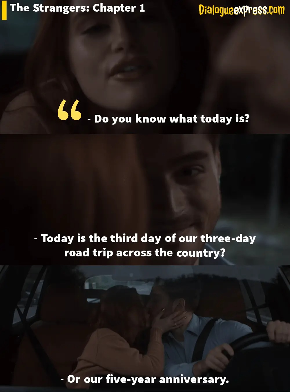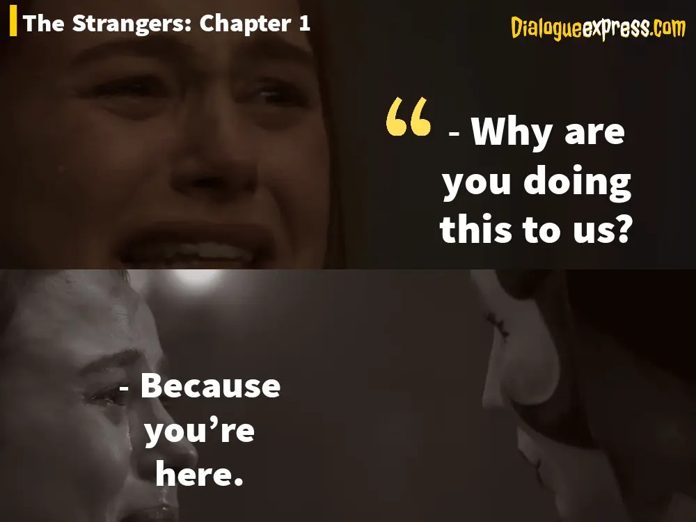 Imagine that you and your beloved are on a road trip, and your car breaks down on a deserted road, forcing you to spend the night in an unfamiliar house. There, you discover that three masked individuals intend to kill both of you without any apparent reason. Spine-chilling, isn’t it? Well, that’s exactly what happens to this couple. So, stay tuned with this article ‘The Strangers: Chapter 1 Movie Dialogues‘, which will make you even more eager to anticipate this movie.